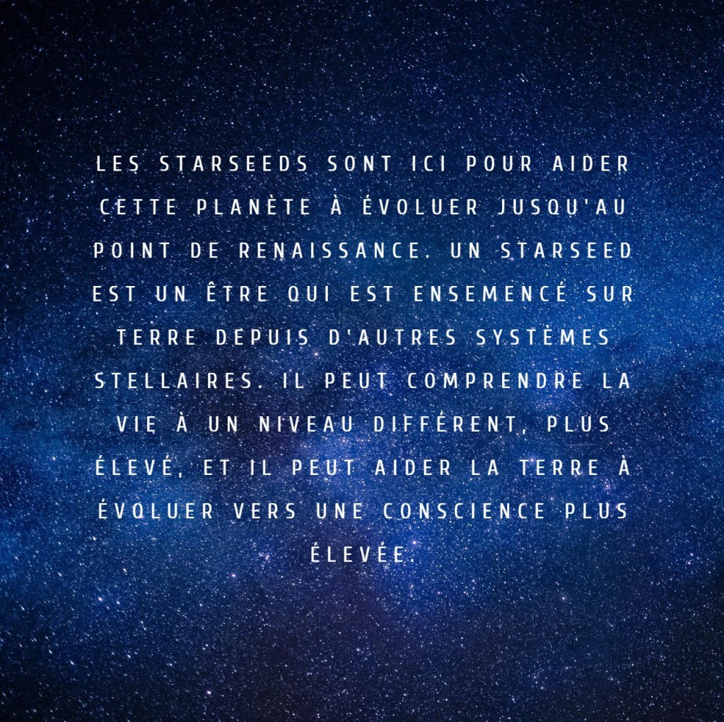 Les Starseeds sont là pour aider cette planète à évoluer jusqu’au point de renaissance. Un Starseed est un être qui a été ensemencé sur Terre à partir d’autres systèmes Stellaires.