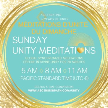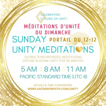 Aidons toute l’HUmanité, les Règnes, les Élémentaux et notre bien-aimée Gaïa à vivre ce puissant passage avec facilité et grâce. Rejoignez des milliers de personnes dans notre pratique hebdomadaire de cinq ans d’Ascension, de Paix et de Conscience d’Unité. Méditations Mondiale d’Unité à 5AM, 8AM et 11AM, heure du Pacifique. (Utilisez le fuseau horaire de … Lire la suite MÉDITATIONS MONDIALES D’UNITÉ DU DIMANCHE